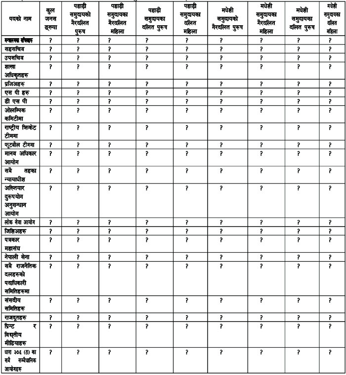 प्रश्न (२) नेपालको सम्बिधानले सबै नागरिकहरुको समान हक र अधिकारको प्रत्याभूति गरिएको भनिएको छ । हो पनि, धेरै हक कायम भएको पनि छन् होलान् । तर यस सम्बन्धमा प्रश्न यो छ कि नेपालमा निम्नलिखित प्रशासनिक, राजनैतिक र सम्बैधानिक पदहरुमा निम्नलिखित तालिका अनुसार जम्मा कति पद बहाल हुने व्यवस्था छ र हाल कुन जनसङ्ख्याको कति व्यक्तिहरु यस तालिका अनुसार कार्यरत छन् ः