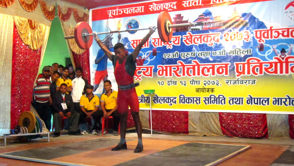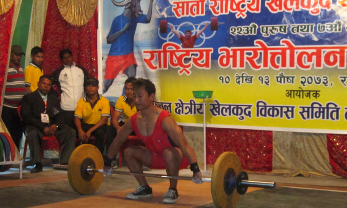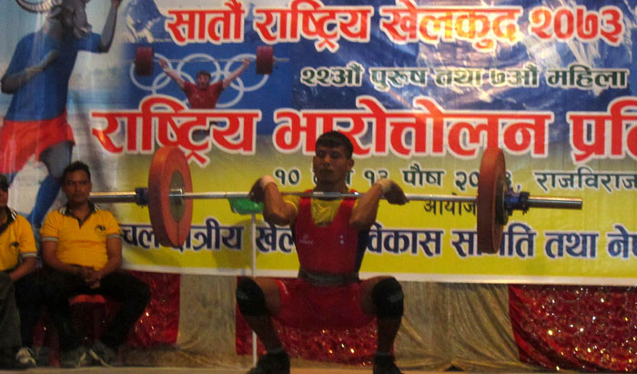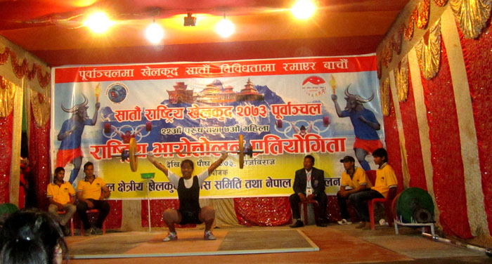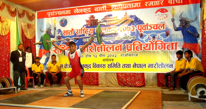 राजविराज, १० पुस । सातौं वृहत राष्ट्रिय खेलकुद प्रतियोगिता अन्तर्गत सप्तरीको राजविराजमा राष्ट्रिय पुरुष तथा महिला भारत्तोलन प्रतियोगिता आइतवारदेखि सञ्चालन भएको छ ।
