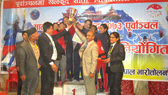 सप्तरी सदरमुकाम राजविराजमा सम्पन्न प्रतियोगितामा ६ स्वर्ण, ८ रजत र १ कास्य सहित १५ पदक जितेर नेपाली सेना प्रथम भएको छ । यसैगरी ६ स्वर्ण, ३ रजत र ३ कास्य सहित १२ पदक जितेर नेपाल प्रहरी दोश्रो स्थानमा रहन सफल भएको छ ।