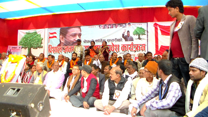सोही कार्यक्रममा विभिन्न पार्टी परित्याग गरी नेपाली कांग्रेसमा प्रवेश गरेकाहरुलाई कांग्रेस नेता निधीले फूलको माला र टिका लगाएर स्वागत गरेका छन् ।
