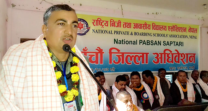 एन प्याव्सन सप्तरीको राजविराजमा जारी पाँचौ जिल्ला अधिवेशनलाई शुक्रवार उद्घाटन गर्दै उनले यस्तो कुरा बताएका हुन् । निजी विद्यालयहरु राज्यले हेर्ने दृष्टिकोण विभेदकारी रहेको भन्दै त्यस विरुद्ध आफूहरुले सशक्त रुपमा आवाज उठाउँदै आएको बताए । दक्ष जनशक्ति उत्पादन गर्नमा निजी विद्यालयहरुले खेलेको भूमिका अतुलनीय रहेको बताउँदै प्रमुख अतिथि शाहीले राज्यले निजी विद्यालयलाई थप प्रोत्साहन गर्नुपर्नेमा घाँटी निमोठ्ने काम गरिरहेको बताए ।