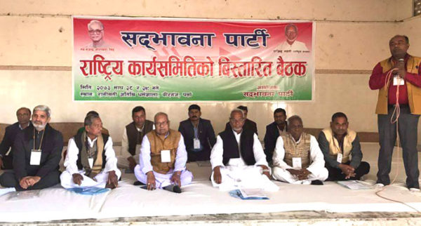 चन्दन रौनियार, वीरगञ्ज, २९ माघ । वीरगञ्जमा शुक्रवारदेखि शुरु भएको सदभावना पार्टीको राष्ट्रीय कार्य समितिको बिस्तारित बैठक आज शनिवार दोस्रो दिन पनि जारी रहेको छ ।