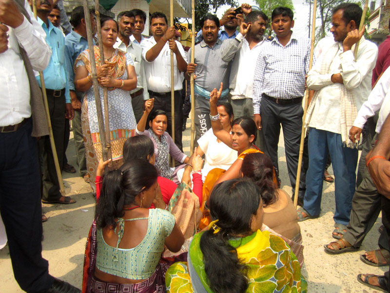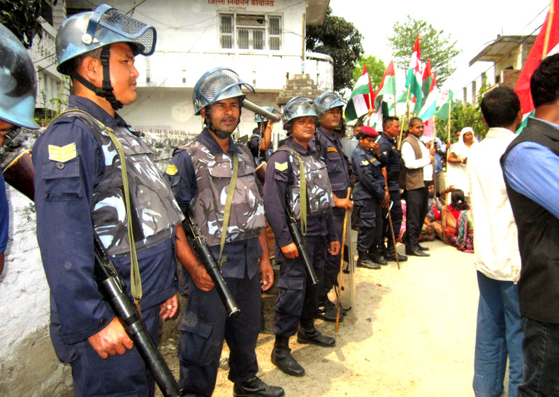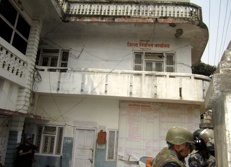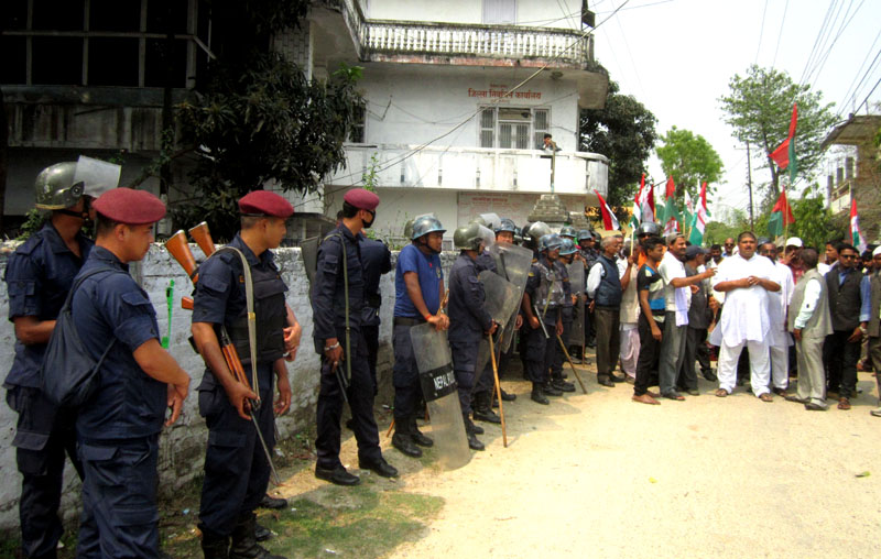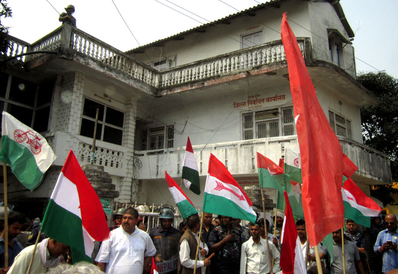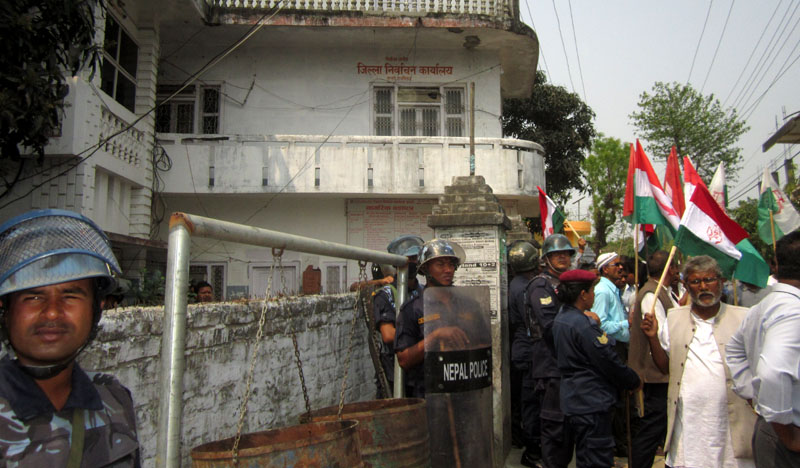 राजविराज स्थित जिल्ला निर्वाचन कार्यालय अगाडि मोर्चाका नेता तथा कार्यकर्ताहरुले विहान १० बजेदेखि घेराउ गरेका हुन् । उनीहरुले कार्यालयको मुख्य गेटमा नाराबाजी गर्दै घेराउ गरेका छन् ।