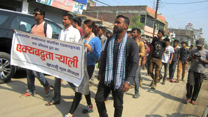 विगत ६ दिनदेखि निरन्तर धर्नामा बस्दा पनि माग सम्वोधन नभएकोप्रति चिन्ता व्यक्त गर्दै उनीहरुले ऐक्यवद्धता जुलुस प्रदर्शन गरेका हुन् । नेपाल पत्रकार महासंघ अगाडिबाट निकालिएको पत्रकारहरुको र्यालीसँगै सप्तरी युथ नेपालको व्यानरमा उनीहरुले ऐक्यवद्धता जुलुस प्रदर्शन गरेका छन् ।