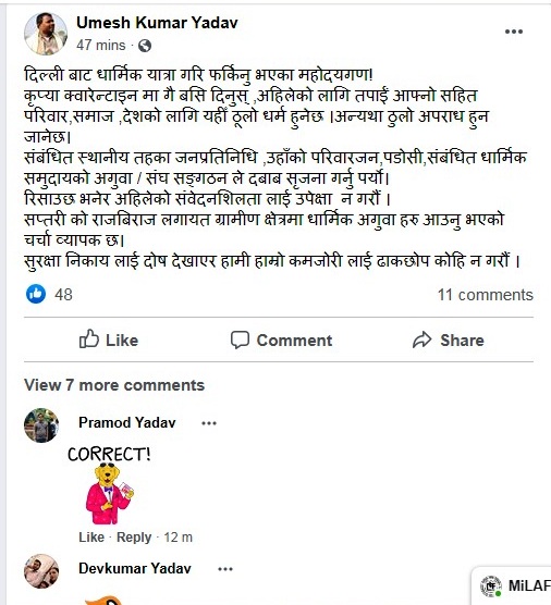 पूर्व सिंचाई मन्त्री एवम् संविधान सभा सदस्य उमेश कुमार यादवले भारतको दिल्लीमा आयोजित जमातमा सहभागी घर फर्किएकाहरुलाई आफै क्वारेन्टाइनमा जान आग्रह गरेका छन् । उनले मङ्गलवार राती करिब ८ बजे सामाजिक सञ्जाल फेसबुकमार्फत यस्तो आग्रह गरेका हुन् । उनले फेसबुकमा यस्तो लेखेका छन्ः