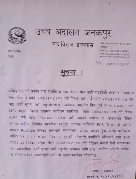 आईतवार उच्च अदालत जनकपुर, राजविराज इजलासका न्यायाधिस ५८ वर्षिय पुरुष तथा वडा प्रहरी कार्यालय राजविराजमा कार्यरत एक जना प्रहरीलाई समेत कोरोना पुष्टि भएको जनाईएको छ । न्यायाधिस काठमाण्डौ निवासी र ३२ वर्षिय प्रहरी जवान सिरहा निवासी हुन् ।