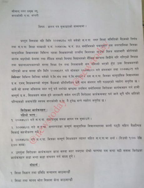 नगरपालिकाले ज्ञापन पत्रलाई भाउ नदिएपछि शिक्षकहरुले शुक्रवार कालो पट्टि वाँधेर पठनपाठन गराएका छन् । असोज २५ गते दिउँसो १ दखि ३ वजेसम्म नगरपालिका कार्यालयमा धर्ना दिने कार्यक्रम रहेको गोवर्धन वैराजी जनता माद्यमिक विद्यालयका शिक्षक उमाकान्त चौधरीले वताए ।
