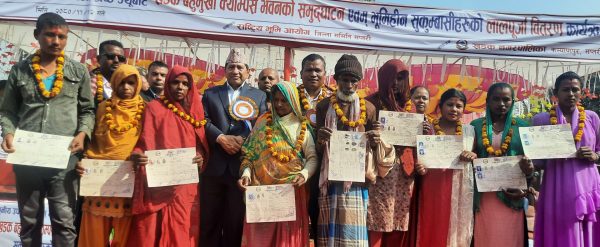 गृहमन्त्री नारायण काजी श्रेष्ठले सप्तरीको खडक नगरपालिकाका भुमिहिन सुकुम्बासीहरुलाई जग्गाधनी प्रमाणपत्र (लालपुर्जा) वितरण गरेका छन् । राष्ट्रिय भुमी आयोग जिल्ला समिति सप्तरीको समन्वय तथा खडक नगरपालिकाद्वारा सप्तरीको कल्याणपुरमा शनिबार आयोजित एक समारोहका विच भुमिहिन सुकुम्बासीहरुलाई गृहमन्त्री श्रेष्ठले लालपुर्जा वितरण गरेका हुन् ।
