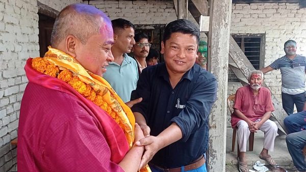 संचार मन्त्री लेखीलाई खदा ओढाएर स्वागत गर्दै संचारकर्मी वृजमान तामाङ। फोटो : उत्तम आचार्य
