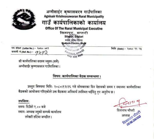 गाउँपालिका अध्यक्षले आइतबार समसामयिक विषयमा छलफल गर्नुपर्ने हुँदा वडा नम्बर १ स्थित तपेश्वरी बजारमा अवस्थित सम्पर्क कार्यालयमा सोमबार १ बजे बैठकमा उपस्थितिका लागि कार्यपालिका सदस्यहरुलाई पत्राचार गरेका थिए ।