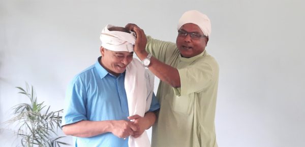 मन्त्री लेखीलाई पगरी उपहार दिदै थारु संस्कृति संरक्षण नेपालका गयानन्द चौधरी। फोटो : न्यूज टुडे
