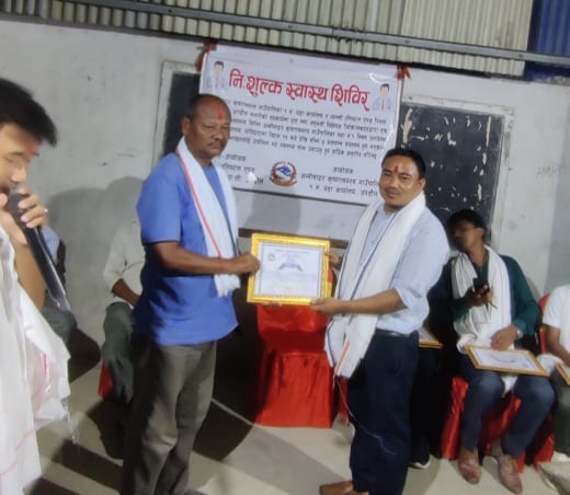 उक्त अवसरमा शिविरमा सेवा प्रदान गर्ने चिकित्सक तथा स्वास्थ्यकर्मीहरुलाई अग्नीसाईर कृष्णावारन गाउँपालिका अध्यक्ष दिनानाथ चौधरीले कदर पत्र प्रदान गरी सम्मान गरेका थिए ।