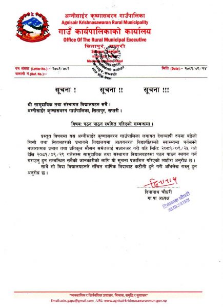 यसैगरी अग्नीसाइर कृष्णासवरन गाउँपालिकाले समेत चारदिन विद्यालयमा विदा दिइएको छ । गाउँपालिका अध्यक्ष दिनानाथ चौधरीले बिहिवार एक सूचना जारी गर्दै पुस २५- २९ सम्म विदा दिएको जानकारी गराएका छन् ।