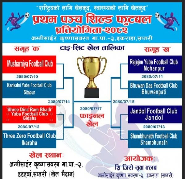 प्रतियोगिता अन्तर्गत मंगलबारको खेल राजाजी युवा क्लव मोहनपुर सप्तरी र भुवनदास फुटबल क्लव भुवनपट्टी वीच हुने उनले जानकारी दिए ।