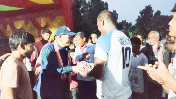 पुरष तर्फको विजेता टिमलाई पुरस्कार प्रदान गर्दै पूर्वमन्त्री चौधरी। फोटो: न्यूज टुडे