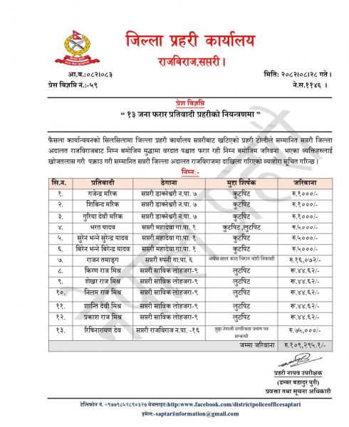 सप्तरी प्रहरीले फरार प्रतिवादी नियन्त्रण अभियानलाई तीब्र बनाएपछि फरार प्रतिवादी धमाधम पक्राउ पर्न थालेका छन् ।
