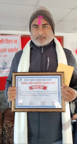 सप्तरी जिल्लालाई कार्यक्षेत्र बनाएर पत्रकारिता गर्दैआएका एक जना पत्रकार शनिबार पुरस्कृत भएका छन् । नेपाल पत्रकार महासंघ सप्तरीले स्थापना गरेको ३० औ लोकेन्द्र स्मृति पत्रकारिता पुरस्कारबाट यसवर्ष पत्रकार विनयलाल कर्ण सम्मानित भएका हुन् ।
