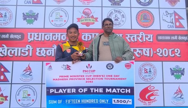 खेलको उत्कृष्ट प्रदर्शनका आधारमा सप्तरीका अभिषेक कार्की ‘प्लेयर अफ द म्याच’ घोषित भए। उनलाई सप्तरी क्रिकेट संघका सदस्य बिरेन्द्र यादवले नगद १ हजार ५ सय रुपैयाँसहित कप प्रदान गरेका थिए।