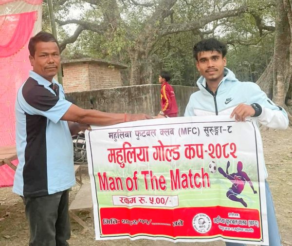 म्यान अफ द म्याचको पुरस्कार ग्रहण गर्दै विरेन्द्र बजारका राहुल विश्वकर्मा । फोटो : न्यूज टुडे
