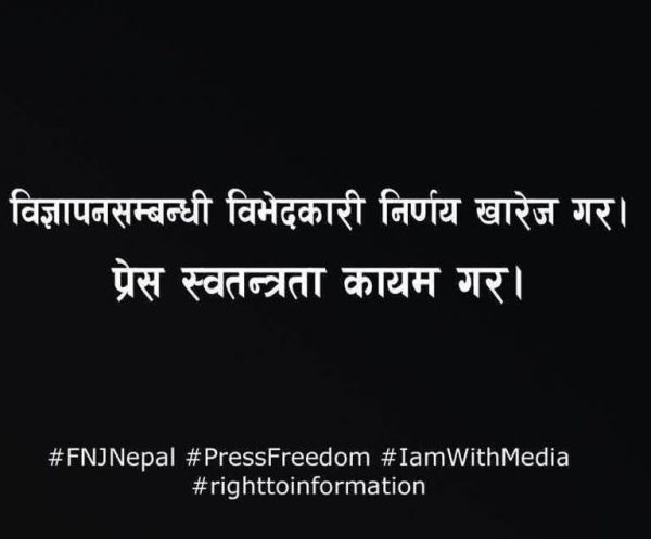 बालेन सरकार कहाँ छ ? आर्थिक नाकावन्दी खेपेको सञ्चार जगत यहाँ छ।’ ‘विज्ञापन सम्बन्धि विभेदकारी निर्णय खारेज गर, प्रेस स्वतन्त्रता कायम गर’ लगायतका चर्को असन्तुष्टि पत्रकारहरुले सामाजिक संजालमा सार्वजनिक गरेका छन् । देशभरका पत्रकारहरुले शुक्रबार आ-आफ्नो संचार माध्यममा सम्पादकीय मार्फत सरकारको निर्णयको चर्को आलोचना गरेका छन् ।